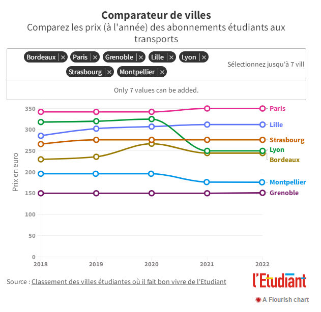 根据最佳学生城市排名的数据,2022年l'Etudiant网站制定了一份45个法国城市交通费报告。其中巴黎(75)依然是法国大都市中最昂贵的城市,其次是第戎(21)和里尔(59)。但在法国的另一些城市,政府正在积极减少年轻人的出行花费,例如圣埃蒂安(Saint-Etienne)(42),该市在四年内将学生票价降低了60%。学生的交通费已从2018年的280欧元/年降至2022年的110欧元/年。