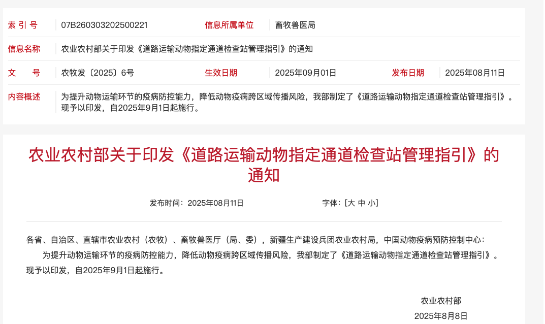 鲁宠协消息:8月8日,为提升动物运输环节的疫病防控能力,降低动物疫病跨区域传播风险,农业农村部发布《道路运输动物指定通道检查站管理指引》的通知,明确自2025年9月1日起,全国范围内道路运输动物需经指定通道检查站接受防疫检查。