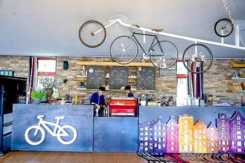 咖啡师精心的制作咖啡,整个俱乐部是以骑行为主题,无处不在的自行车元素,从大布局到小物件无不体现出装修的别具匠心。骑行热了来杯冰凉的香草星冰乐简直幸福极了,味道很好喝。
