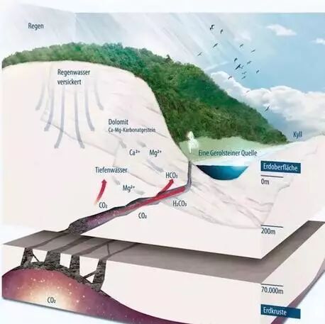 大多数德国的矿泉水源泉都来自于火山地区,蕴含大量二氧化碳成分的岩石。而矿泉水则会伴随着这种天然气体通过地下岩石层,由此产生了含二氧化碳的矿泉水。而其他欧洲国家的火山岩中往往所含的二氧化碳成分更低一些,这就是为什么其他国家喝的气泡矿泉水相对于德国而言要少很多的原因。