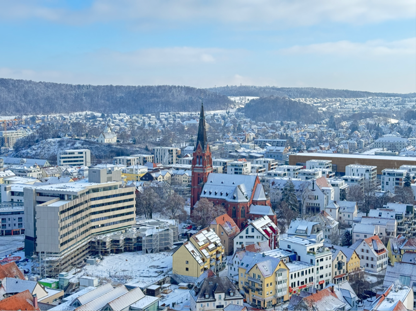 1月11日,访学交流团先是调研了海登海姆商业中心,实地感受当地商业文化,了解到德国“休息日闭店”的市场习惯。团队登临海伦斯坦城堡,沿着蜿蜒的石阶一步步向上攀登,冬日的寒意渐渐被运动的热情驱散,登顶俯瞰城市全景。