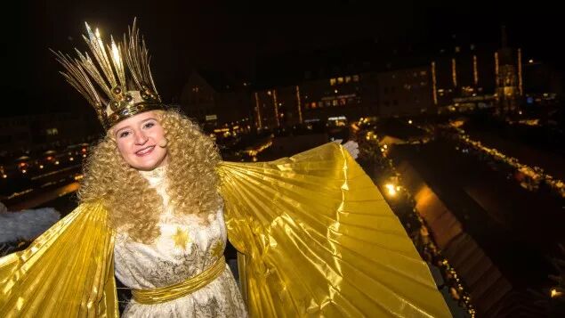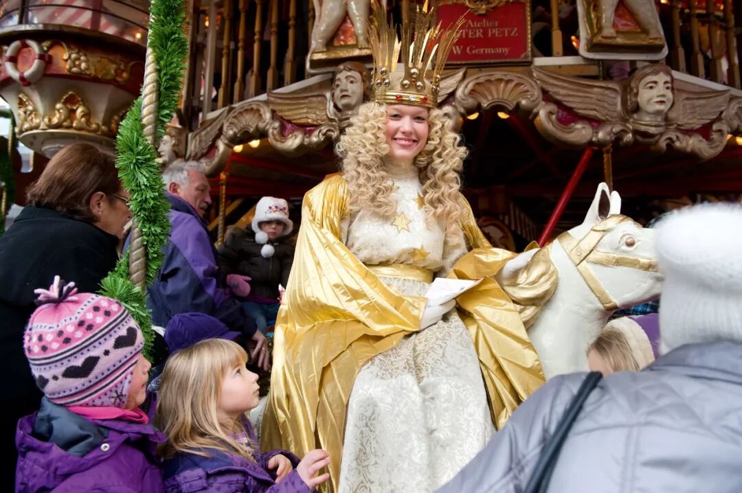 纽伦堡圣诞市场还有个很有意思的传统项目,纽伦堡市民们每年会选一个小孩作为Christkind,年龄介于16到19岁,身高1.6米以上,不恐高,圣诞节开幕那一天小孩会在圣母教堂的阳台上朗诵一个序幕,开启圣诞市场。