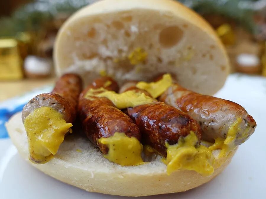 除此之外,纽伦堡香肠(NürnbergerRostbratwürstchen)也深受世界各地的喜爱。三个小香肠放在切开的面包(“Weggla”)中,上面放着芥末。