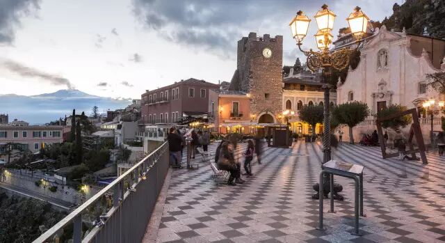 这是一个具有典型西西里岛风格的广场,独具特色的黑白地砖,远处可见的爱奥尼亚海和埃特纳火山。