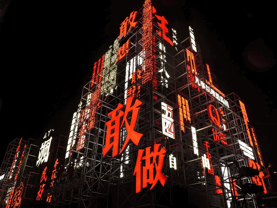从视觉上以强烈蓝橙冷暖色调结合霓虹灯光的色彩对比和光感运用,与背景形成强烈的视觉冲击力和形式感的视觉反差,大型的红旗突出在天际线使画面形成富有冲击力的超现实感。