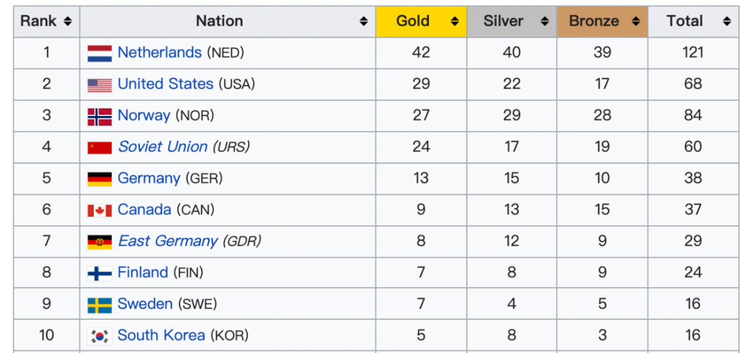 在速度滑冰的奖牌榜上,荷兰以42枚金牌、121枚奖牌的数量遥遥领先其他国家,傲居首位。可谓是当之无愧的速滑之王,相信即使是号称「人生没有任何观点一致」的克鲁伊夫和范加尔,估计在这件事上也说不出两个答案。