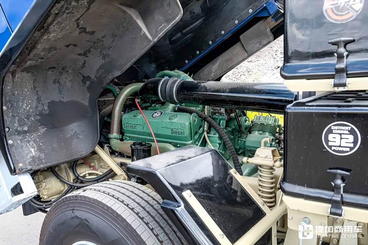 掀起驾驶室后,车辆的心脏便映入眼帘:底特律柴油8V92TA两冲程柴油机,输出约430匹马力。其名称中的8代表8汽缸,92代表单气缸容积92立方英寸,约为1.5升。作为一台两冲程柴油机,它的工作声音相当特殊,匹配富勒RTO 12513非同步手动变速箱,基本是全套的美式动力链。