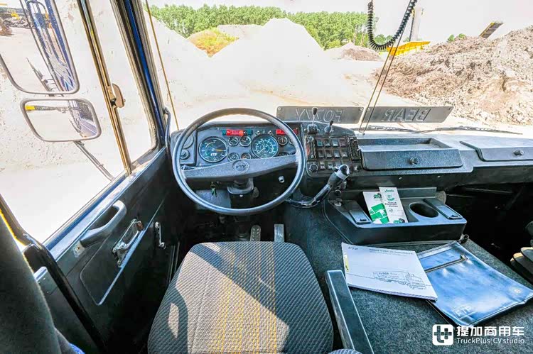 对舒适度、人性化的落后认知也存在于这台卡车之上:它的驾驶室采用平头结构,虽然是一台不折不扣的长款驾驶室,但垂直空间确实是不足。车顶上安装了灯箱、气喇叭、旋转告警灯等附件,同时驾驶室侧壁上带有黑色的扶手,增强实用性。