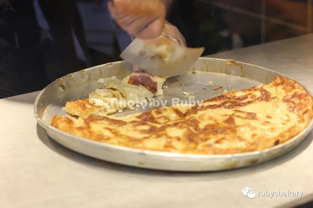 薄而长的面饼好像一叶扁舟,上面刷黄油,放奶酪和其它馅