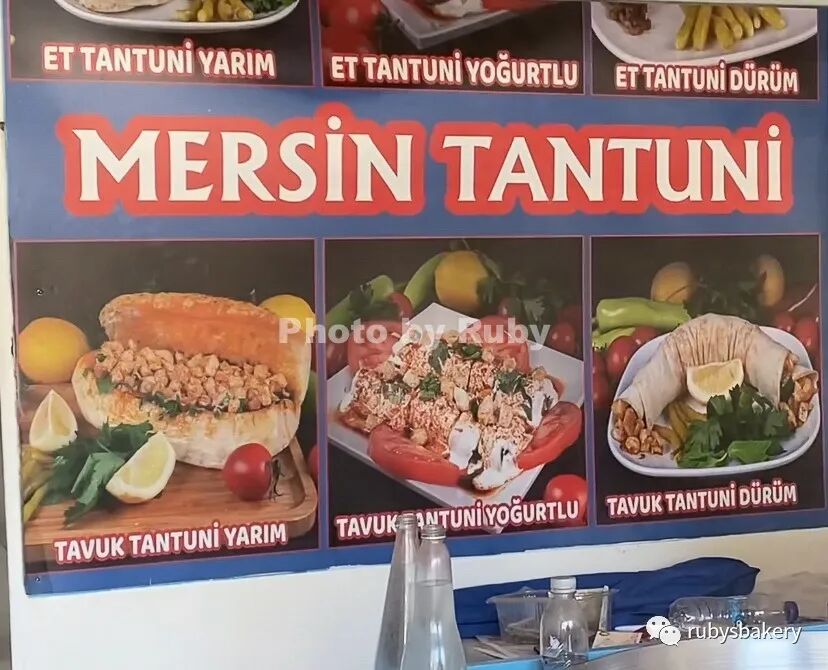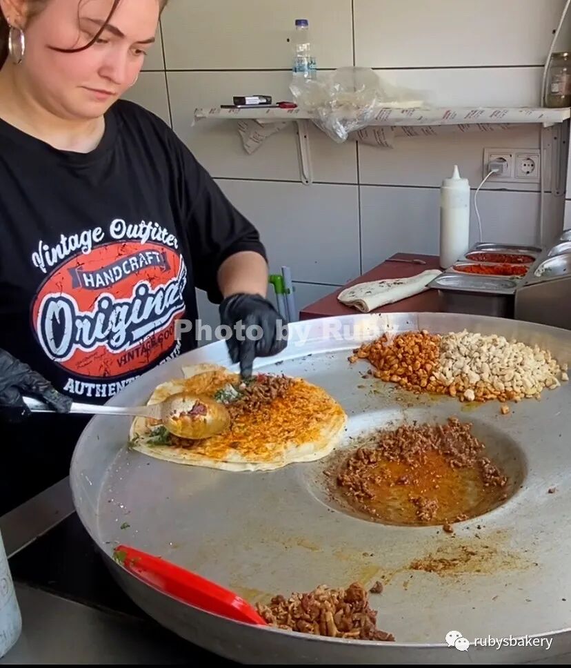 tantuni,发音大概是“坦图尼”。我感觉算是小炒肉(鸡肉或牛肉)卷饼。一般都是圆形大锅,中间一个凹槽,油热放辣椒粉炒碎肉片,期间加了几次液体的调味汁,然后加洋葱和其他蔬菜卷着薄薄的饼。可以直接吃,也可以表面淋酸奶吃。