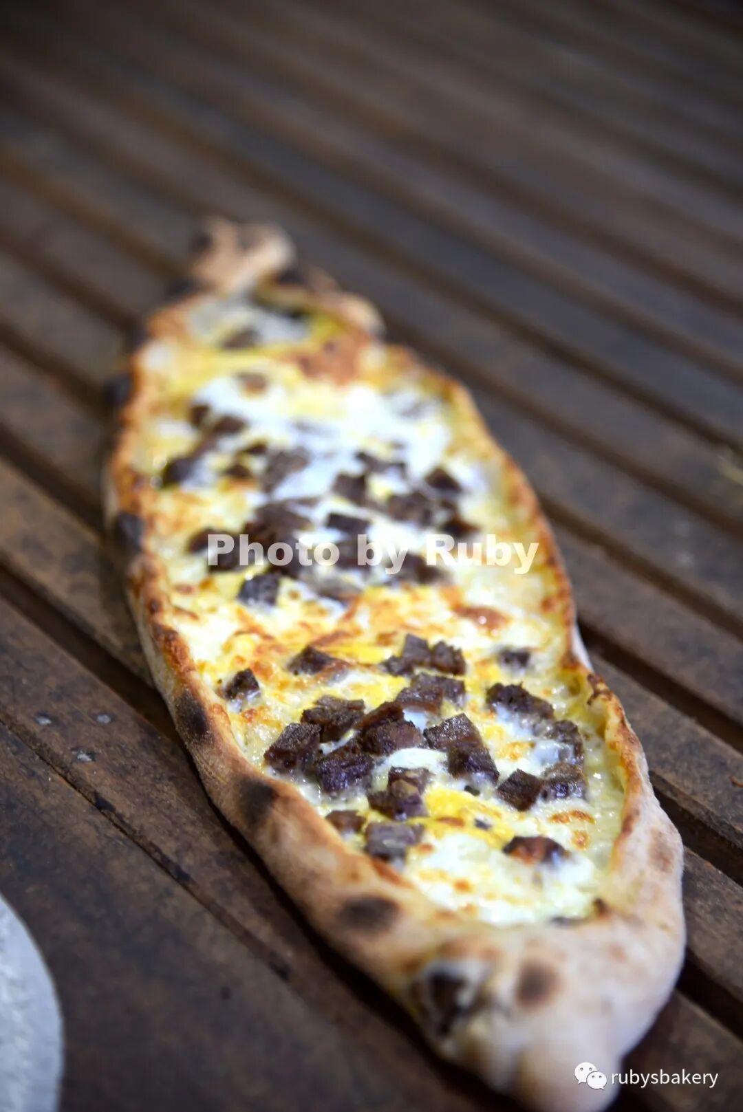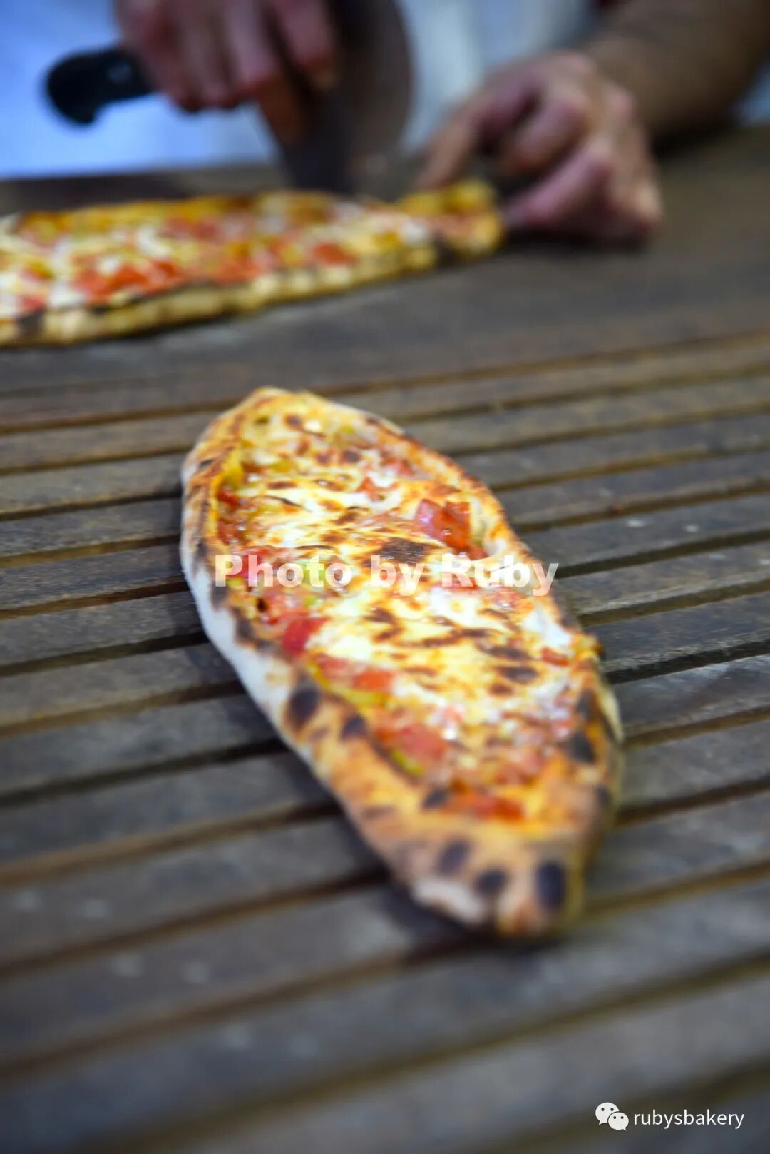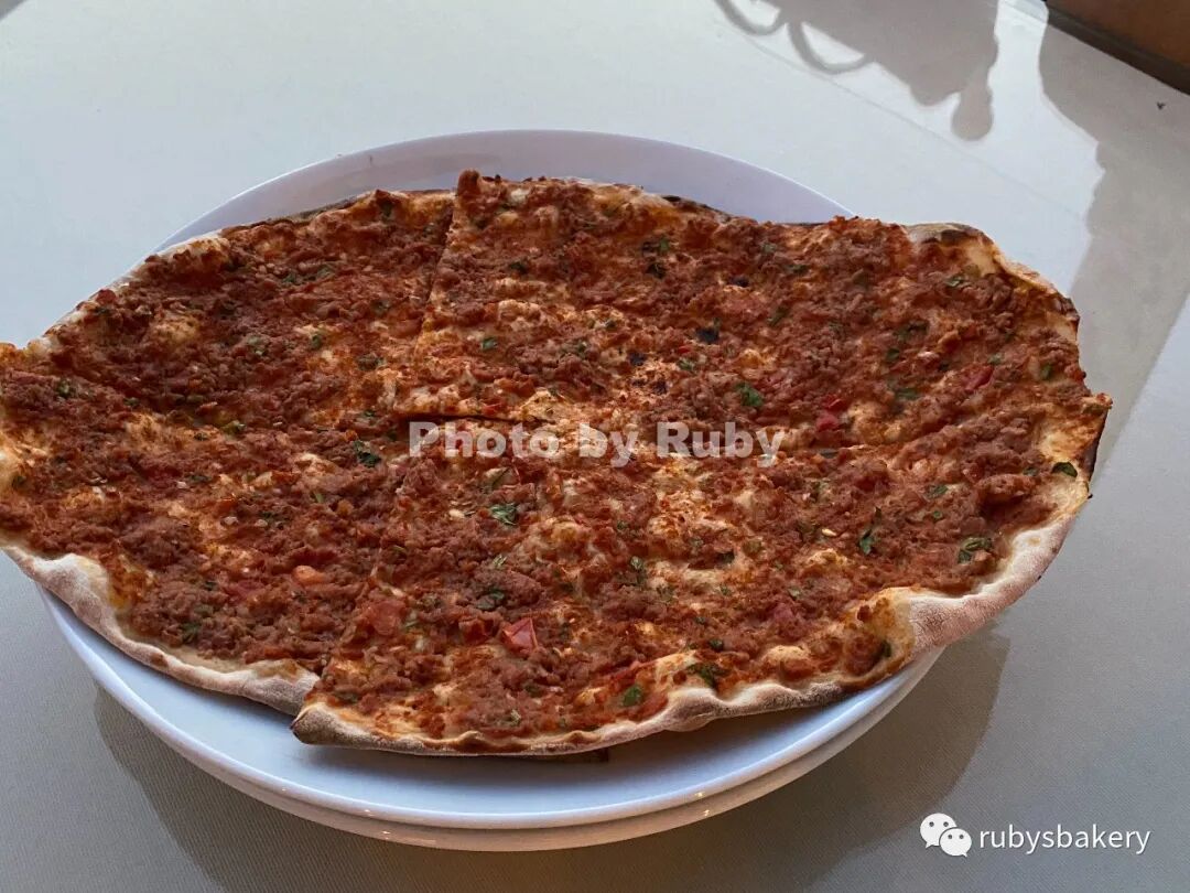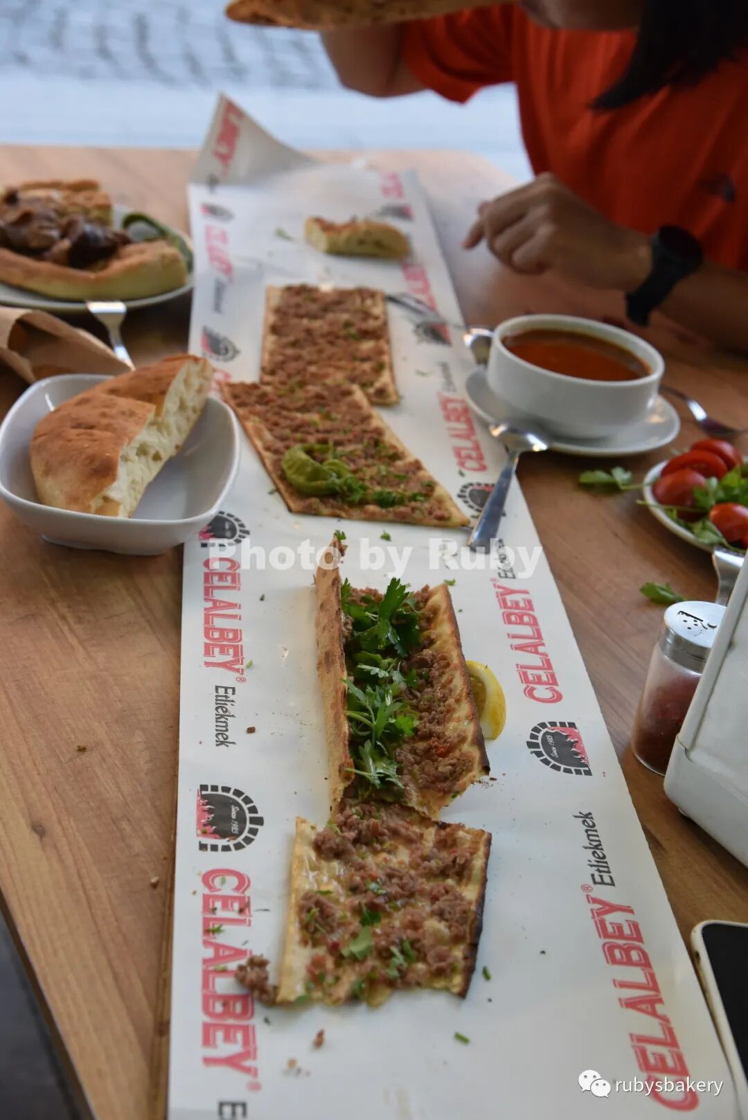 这是我在土耳其除烤肉之外,最爱吃的,吃了好多次,巴不得每天都要吃一个的程度。薄如纸的面皮上,抹一点碎肉末,肉末也是小肉末➕番茄碎➕洋葱碎➕蒜等随意调味,调味料当然也是土耳其的调味料,之后放砖窑里烤50秒-1分钟。非常薄,咬一口咔嚓一声。价格大概20-25里拉,因为很薄份量小,如果吃饱要吃好几个,算是小吃吧。