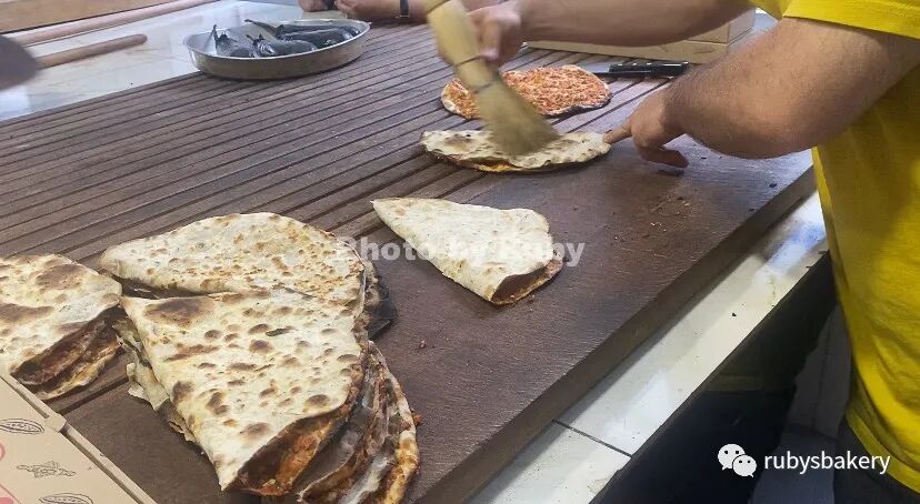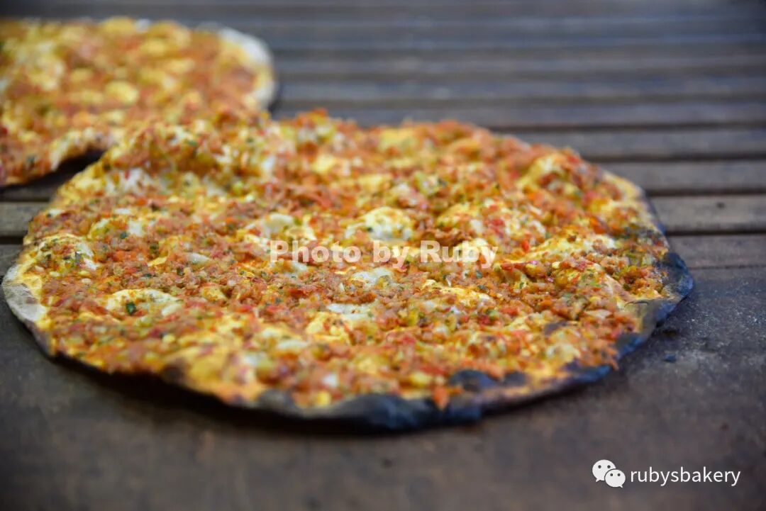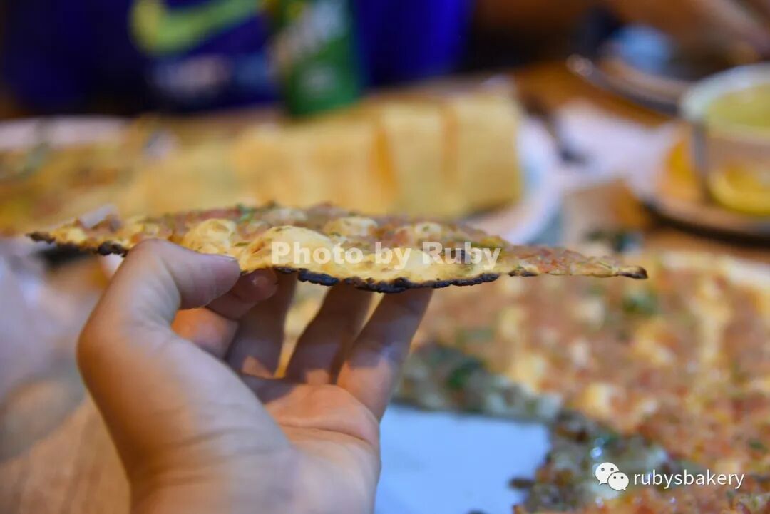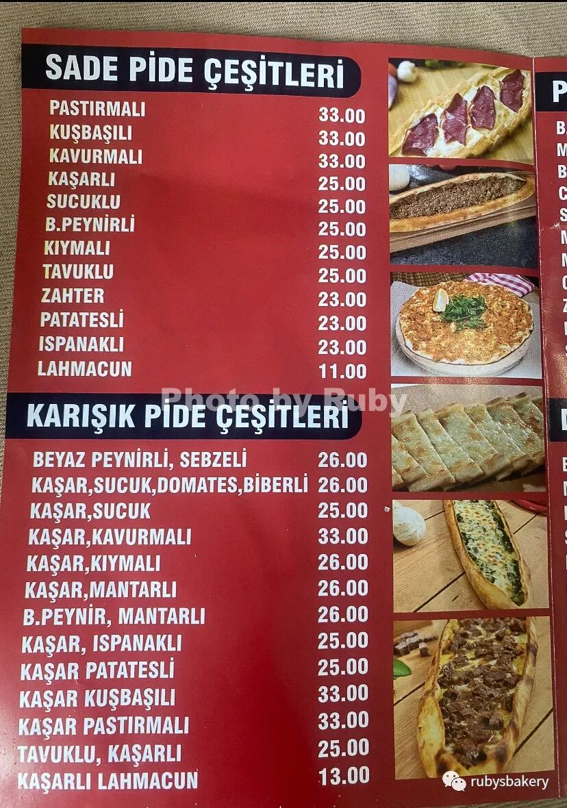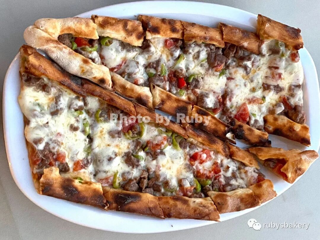 这是我在土耳其除烤肉之外,最爱吃的,吃了好多次,巴不得每天都要吃一个的程度。薄如纸的面皮上,抹一点碎肉末,肉末也是小肉末➕番茄碎➕洋葱碎➕蒜等随意调味,调味料当然也是土耳其的调味料,之后放砖窑里烤50秒-1分钟。非常薄,咬一口咔嚓一声。价格大概20-25里拉,因为很薄份量小,如果吃饱要吃好几个,算是小吃吧。