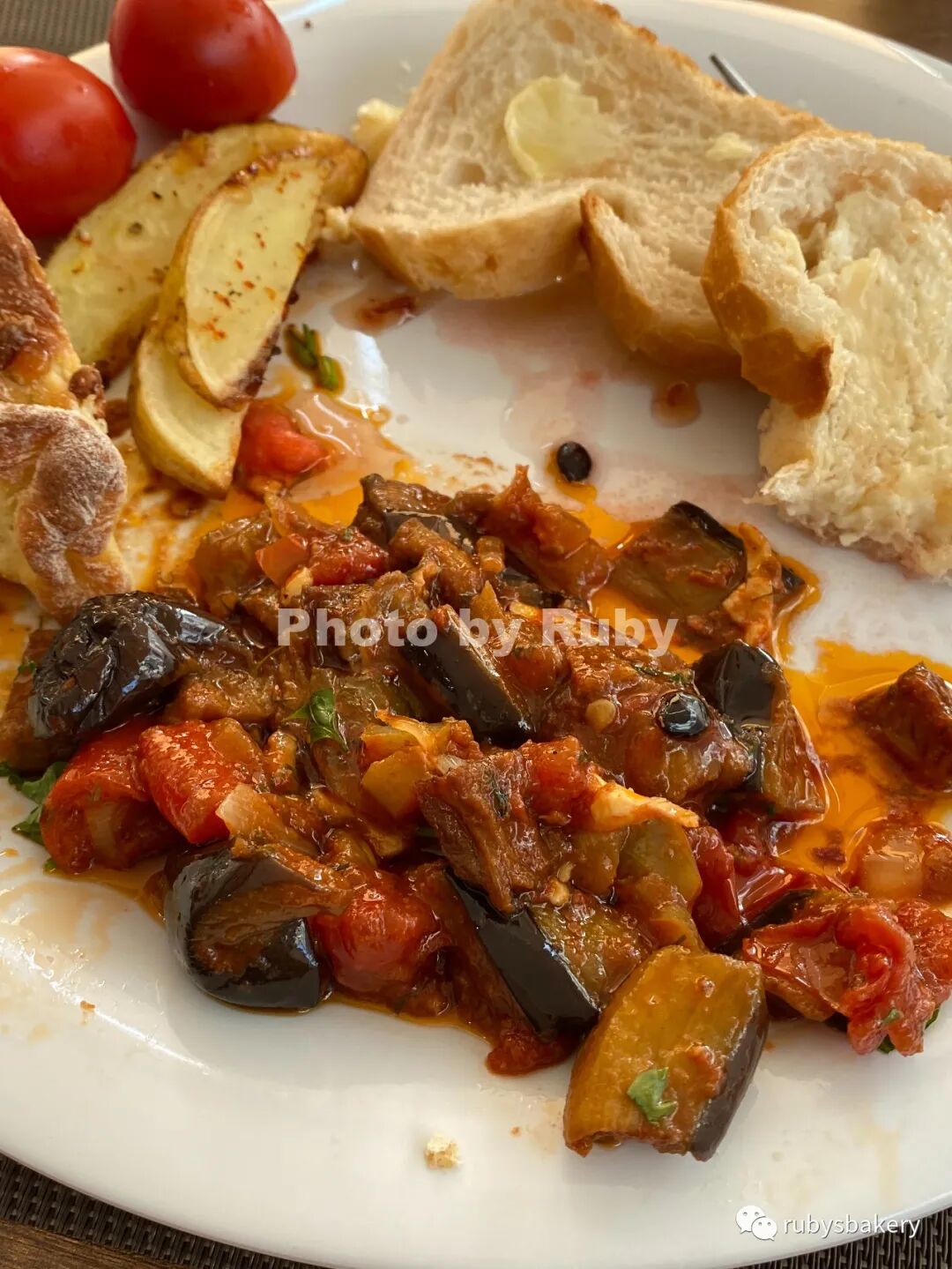 碎牛肉炖茄子,里面还放了西红柿和甜椒,配米饭