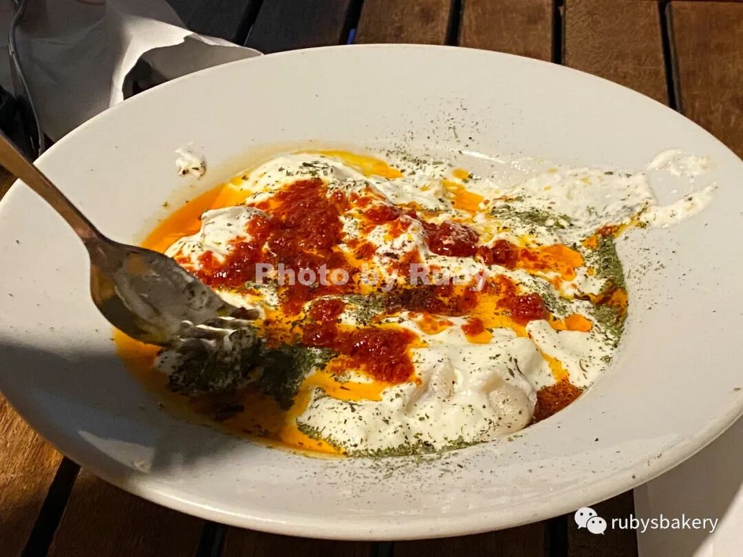淋酸奶的非常好吃。酸奶表面淋的红红的,其实更多的是橄榄油爆炒的番茄泥,只有一点点辣椒粉,很红,但是不辣。来土耳其真的要试试它们淋酸奶的菜式,非常清新。