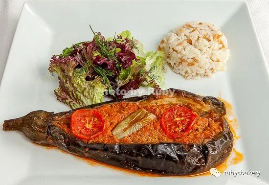 烤茄子,茄子里塞的肉调味的肉和番茄泥和洋葱。土耳其航空的飞机餐,也有这道菜,我家去土耳其的飞机上就吃到了,那是第一次感受到土耳其风味,飞机餐都做的很好吃很用心。
