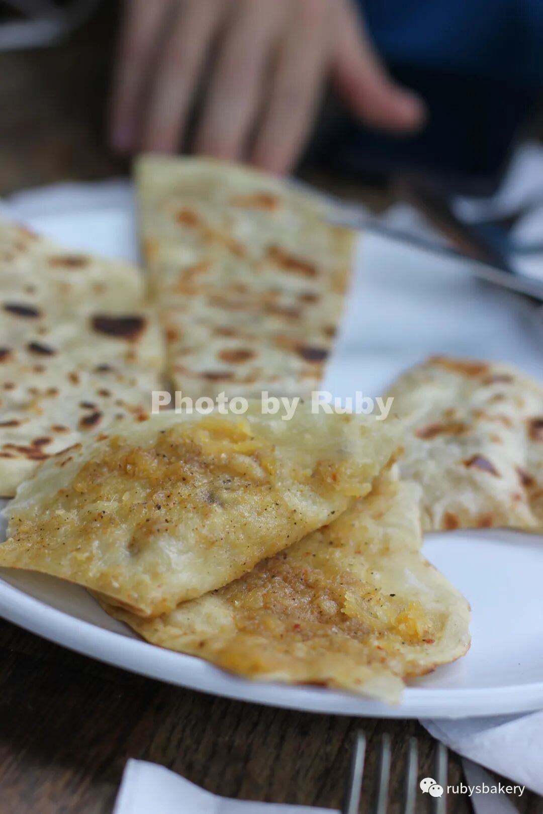这是一种带馅薄饼,在大圆木板上擀面,放馅,对折收口然后锅上烙,因为面皮很薄,馅也是薄薄一层,所以2-3分钟就烙好。