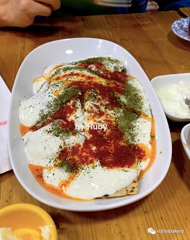 我家点了小碎肉馅(minced meat),淋土耳其特有的酸奶吃法(with yogurt)。酸奶是原味加蒜调香,表面再淋一层橄榄油炒香的番茄泥和辣椒粉炒出的红油,和香叶子,全世界大概只有这里才能吃到这么好吃的淋酸奶的薄饼吧。