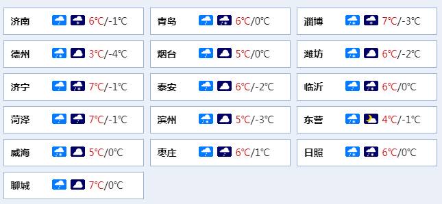 >>>12日白天到夜间,全省天气阴,济南南部、淄博南部、潍坊南部和临沂北部有小雨转小到中雪局部大雪,鲁南地区有小到中雨转雨夹雪,其他地区有小雨转雨夹雪或雪。夜间最低气温:鲁西北、鲁中山区和半岛内陆地区-3℃左右,其他地区0℃左右。最高气温:鲁中山区和沿海地区4℃左右,其他地区6℃左右。