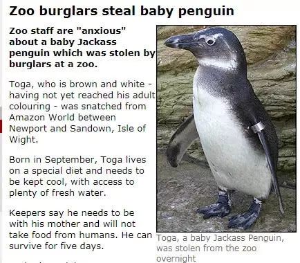 这座动物园并不是因为这些特有的热带动物而出名的,而是因为一起惊动全国的盗窃案。据英媒报道,2005年12月19日,有一个窃贼从动物园中盗走了只有三个月大的南非企鹅Toga,情况非常危急!